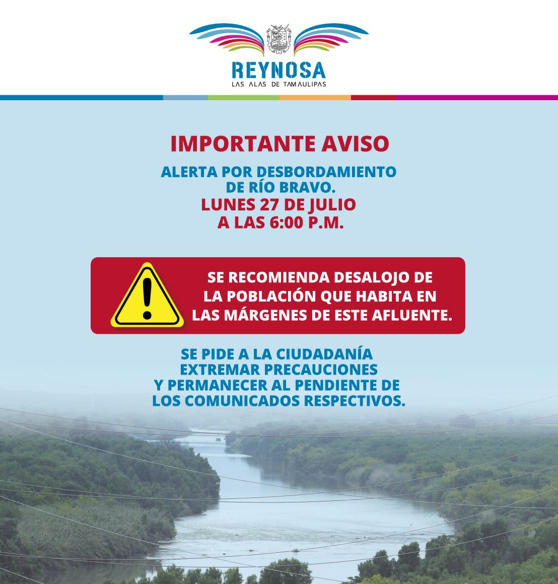 REYNOSA TAM.- El Gobierno Municipal recomienda a la población que habita la margen mexicana del río Bravo, a residentes de la Zona Centro y colonias aledañas, a desalojar sus viviendas ante el inminente desbordamiento del citado afluente, que se pronostica suceda a partir de las 6 de la tarde, de este lunes 27 de julio.