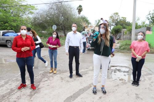 REYNOSA, TAM.-A fin de apoyar en sus labores de saneaniento los hogares de Reynosa, la Alcaldesa Maki Esther Ortiz Domínguez, recorrió colonias inundadas para entregar paquetes de limpieza a las madres de familia.
