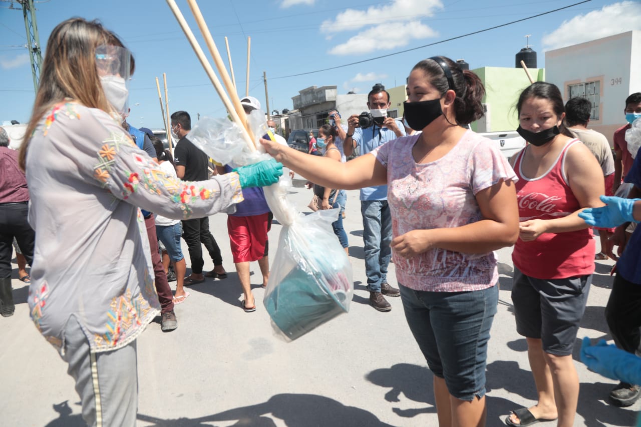 En la entrega de kits de limpieza, por parte de la Alcaldesa Maki Ortiz apoyaron, el Secretario Técnico del Ayuntamiento, Hugo Ramírez Treviño, y Víctor Hugo García Flores, Nilza Hurtado Rodríguez, Mario Alberto Ramírez Ruiz y José Alfonso Peña Rodríguez, integrantes del Cabildo.