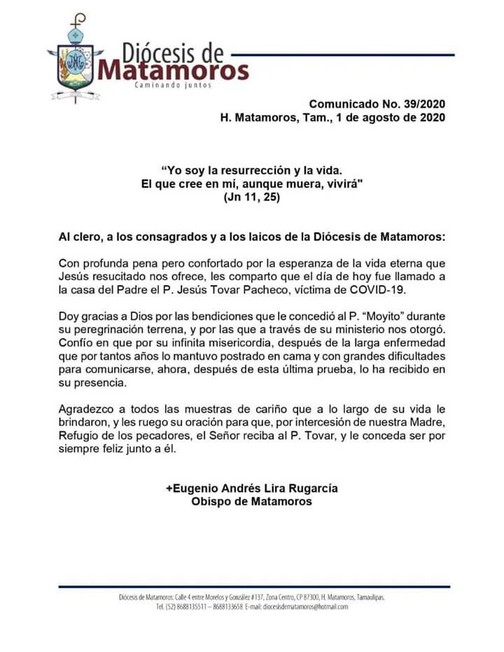 Mediante un comunicado firmado por el Obispo Eugenio Andrés Lira Rugarcia, emitido este primero de agosto, la Diócesis de Matamoros confirmó el deceso del Padre Jesíºs Tovar Pacheco, quién se encontraba viviendo en la Casa Sacerdotal de la Diócesis.