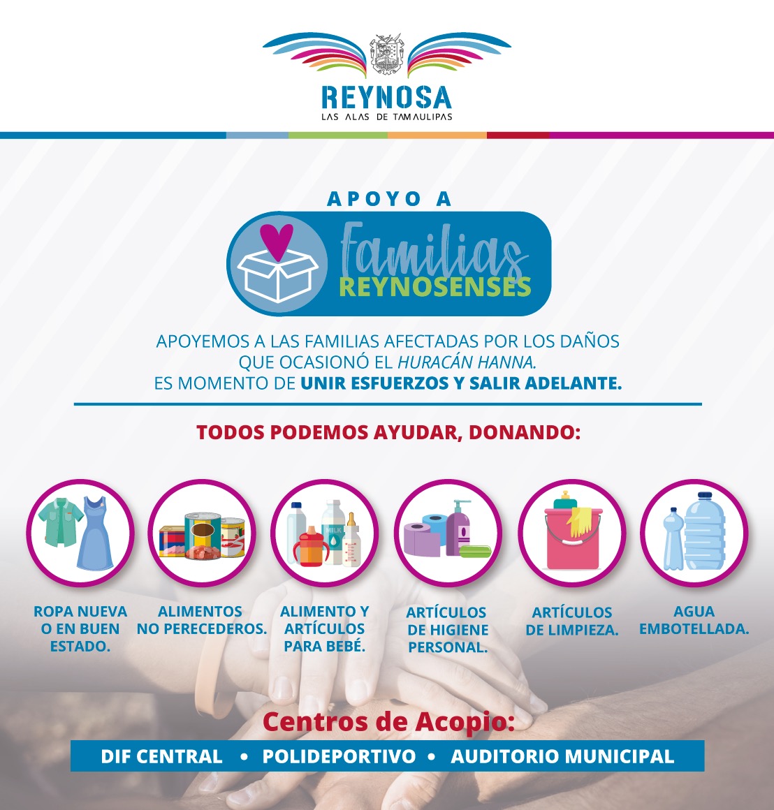 REYNOSA, TAM.- La Doctora Maki Esther Ortiz Domínguez, invita a la población a extender su mano para donar alimentos y bebidas a los reynosenses, damnificados por el Huracán Hanna, y que hoy necesitan de su ayuda, que puede ser entregada en el Polideportivo, Auditorio Municipal y DIF Central.
