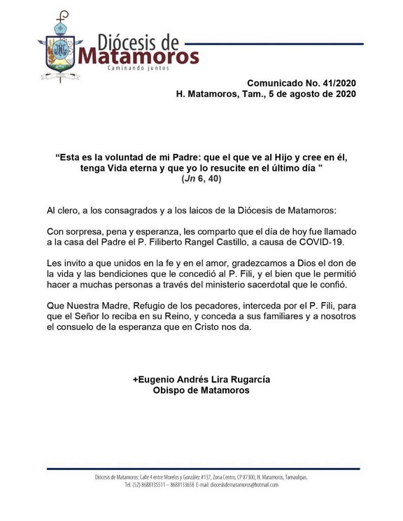 Cabe señalar que este documento emitido por la Diócesis de Matamoros, es firmado por el Obispo Eugenio Lira Rugarcia, quién de esta manera ha estado dando a conocer información sobre los integrantes de esta organización que han dado positivo a Covid-19 y el fallecimiento de dos sacerdotes.
