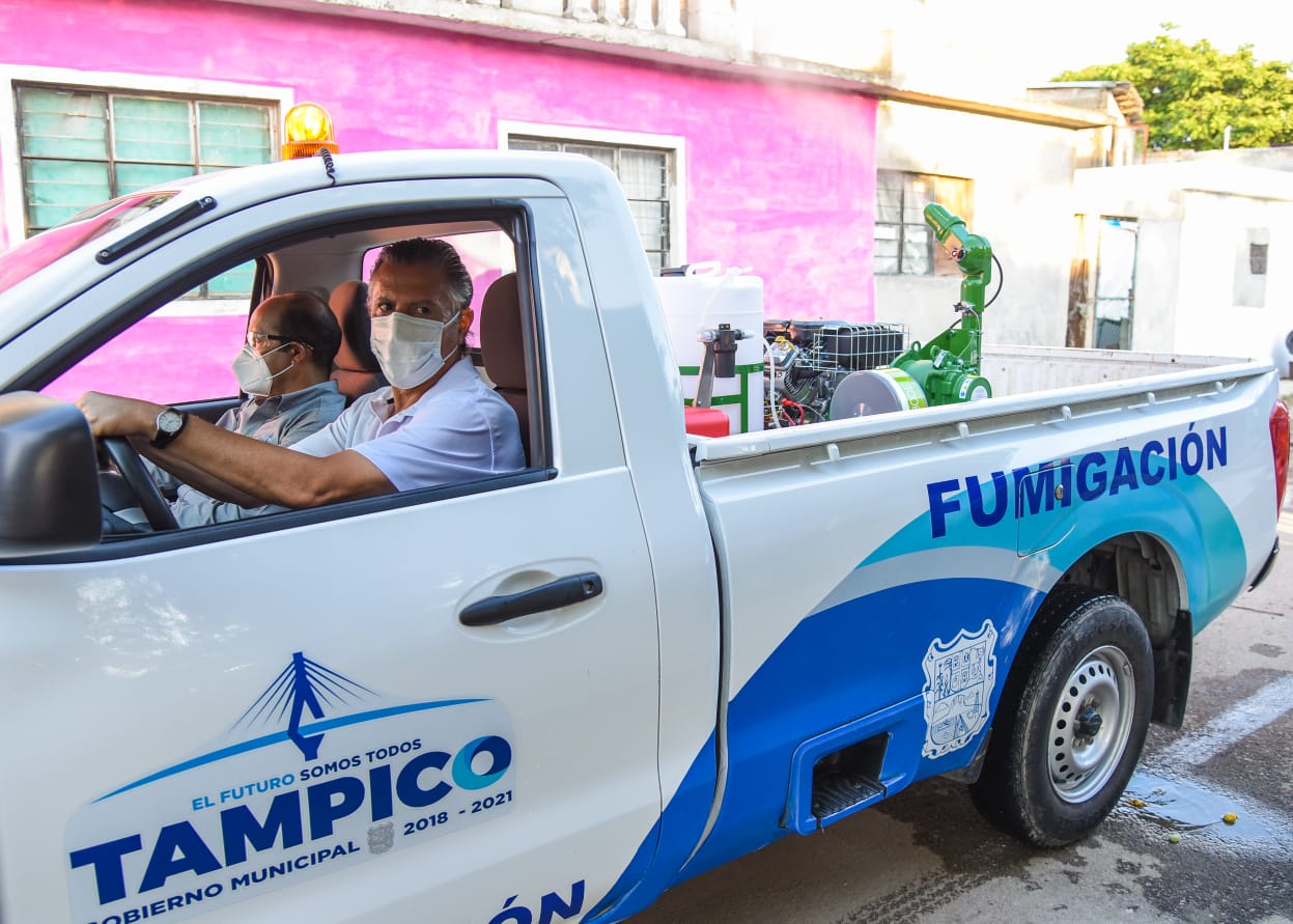 Tampico, Tamaulipas.-Con el propósito de eliminar la presencia del mosco transmisor del dengue, el Presidente Municipal Chucho Nader, encabezó este miércoles una extensa jornada de fumigación en la que participaron diversas cuadrillas y equipo de Servicios Píºblicos en las colonias; Pescadores, Sauce, Ramos y Peralta, entre otras.