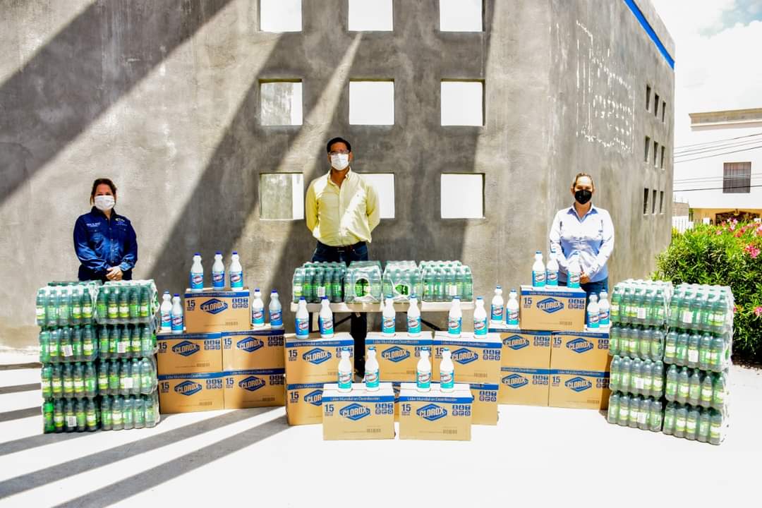El presidente del Voluntariado Juvenil, Carlos Peña Ortiz refirió que la empresa Comercial Treviño donó 40 cajas de cloro y 40 de pinol de medio litro para poder hacer más kits de limpieza.