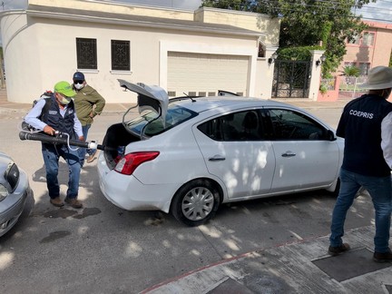 Matamoros, Tamaulipas.- Con el objetivo de reducir el níºmero de contagios de Coronavirus que se ha tenido en la ciudad, autoridades de la Secretaría de Salud a través del personal de Coepris llevan acabó la desinfección de vehículos en diversos sectores de la ciudad.