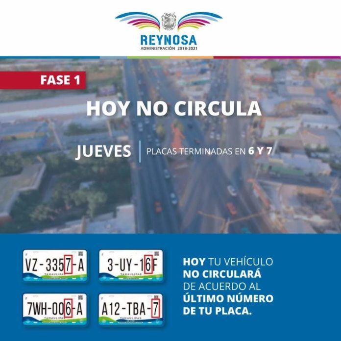 REYNOSA, TAM.-El Gobierno Municipal informa a los conductores de vehículo con placas que terminen con los números 6 y 7, que este jueves 13 de agosto no pueden circular por disposición del Consejo de Seguridad en Salud de Tamaulipas, con la finalidad de reducir la movilidad para abatir los contagios de Coronavirus.