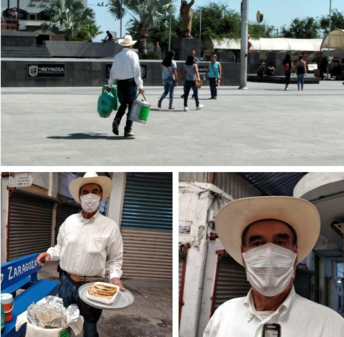 Reynosa, Tamaulipas.- La situación económica por la que atraviesan los comerciantes informales durante esta pandemia no ha sido nada fácil, pues debido a las restricciones sanitarias sus ventas se han visto afectadas hasta en un 100%, como es el caso de este vendedor de tacos de harina que le llaman “El Vaquero”, o “Fox” por su gran parecido al ex presidente de la república, pues antes de la pandemia lograba vender hasta 200 tacos de harina por día, y hoy sólo logra colocar algunos 60.