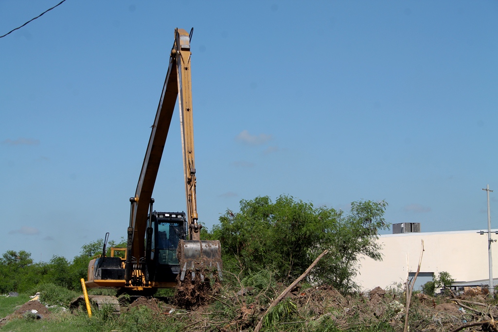 Con apoyo de maquinaria especializada, cuadrillas de la Comision Nacional del Agua realizan los trabajos de desmonte, limpieza y dragado en los drenes y canales de la ciudad.