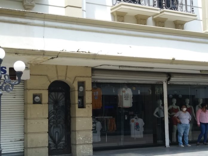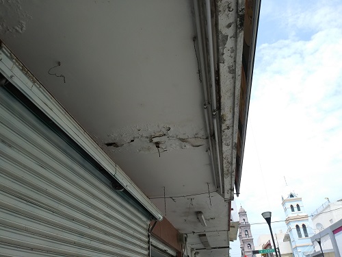En la zona centro de Tampico, por la calle Benito Juárez se observó a varios edificios con deterioro en sus cornisas, que requieren de mantenimiento, al igual que por la Carranza.
