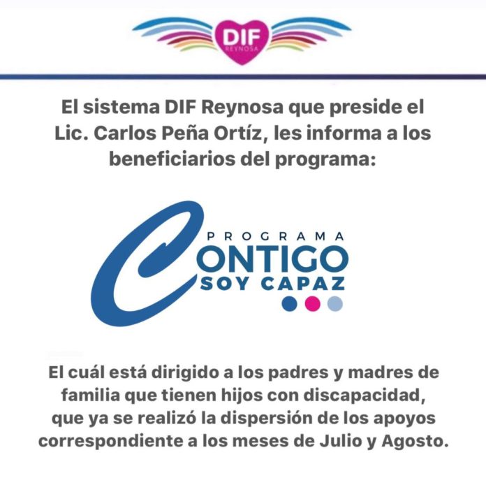 REYNOSA, TAM.-El sistema DIF Reynosa que preside Carlos Peña Ortiz, informa a los beneficiarios del programa “Contigo Soy Capaz”, que está dirigido a padres y madres de familia que tienen hijos con discapacidad, que ya se realizó la dispersión de los apoyos correspondientes a los meses de julio y agosto.