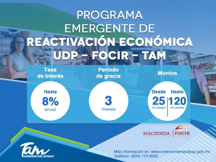 Ciudad Victoria, Tamaulipas. – El Gobierno de Tamaulipas, en coordinación con la Unidad de Desarrollo Productivo y el Fondo de Capitalización e Inversión del Sector Rural, lanzó el “Programa emergente de reactivación económica UDP – FOCIR – TAM”, que consta de financiamiento a empresas formales con menos de 10 empleados afiliadas al IMSS, en actividades económicas con potencial para contribuir a la reactivación económica equitativa.