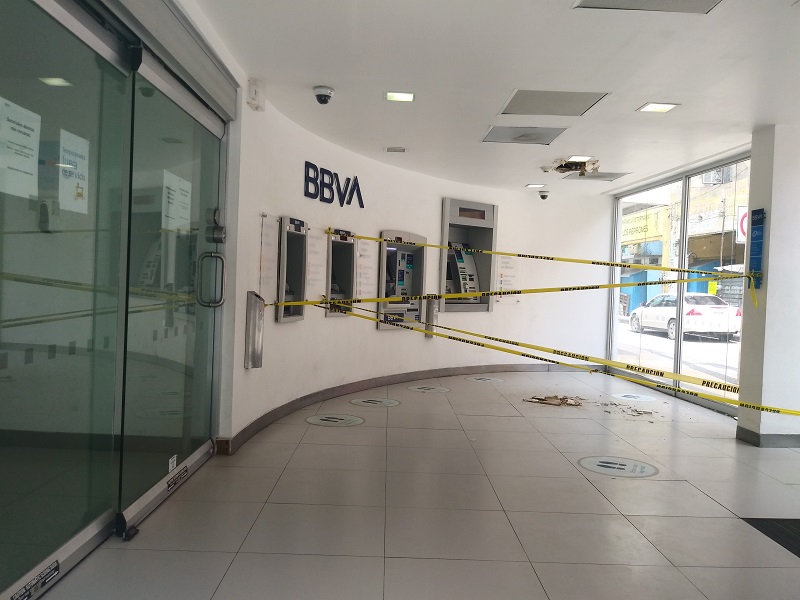 Ante ello, con cinta amarilla de precaución fueron acordonados los más de 4 cajeros automáticos que están en el lugar para que nadie los use y evitar que alguna persona salga lastimada, pero además se colocó el candado en la puerta principal de BBVA.