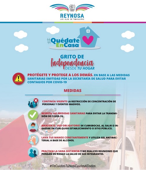 El Ayuntamiento de Reynosa, que encabeza la doctora Maki Esther Ortiz Domínguez, dio a conocer que la ceremonia conmemorativa al 210 Aniversario del inicio de la independencia de México no será celebrado en lugares públicos, en la plaza principal ni en recintos con acceso al público.
