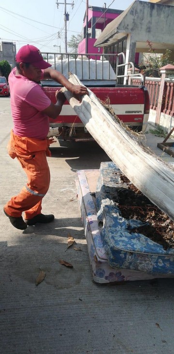 “Son colchones, muebles, refrigeradores, si se ha incrementado mucho, y el sábado tengo un promedio de más cantidad porque se incrementa mucho porque la gente como perifoneamos cuando vamos a la jornada la gente sabe que vamos a la colonia y sacan sus cacharros y esa es la idea, por eso vamos a las colonias, pero la gente que saca a sus calles o a un terreno, yo prefiero que me hablen a la oficina y atendemos ese llamado y vamos a su casa. Manejamos entre 500 a 800 colchones al mes”.