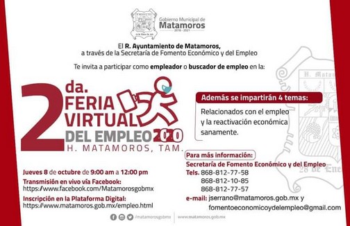 Matamoros, Tamaulipas.- Con el fin de apoyar a la población matamorense que perdió su empleo a causa del Coronavirus, este jueves 8 de octubre se realizará la segunda feria del empleo de manera virtual para evitar aglomeraciones y con ello un contagio masivo del virus.