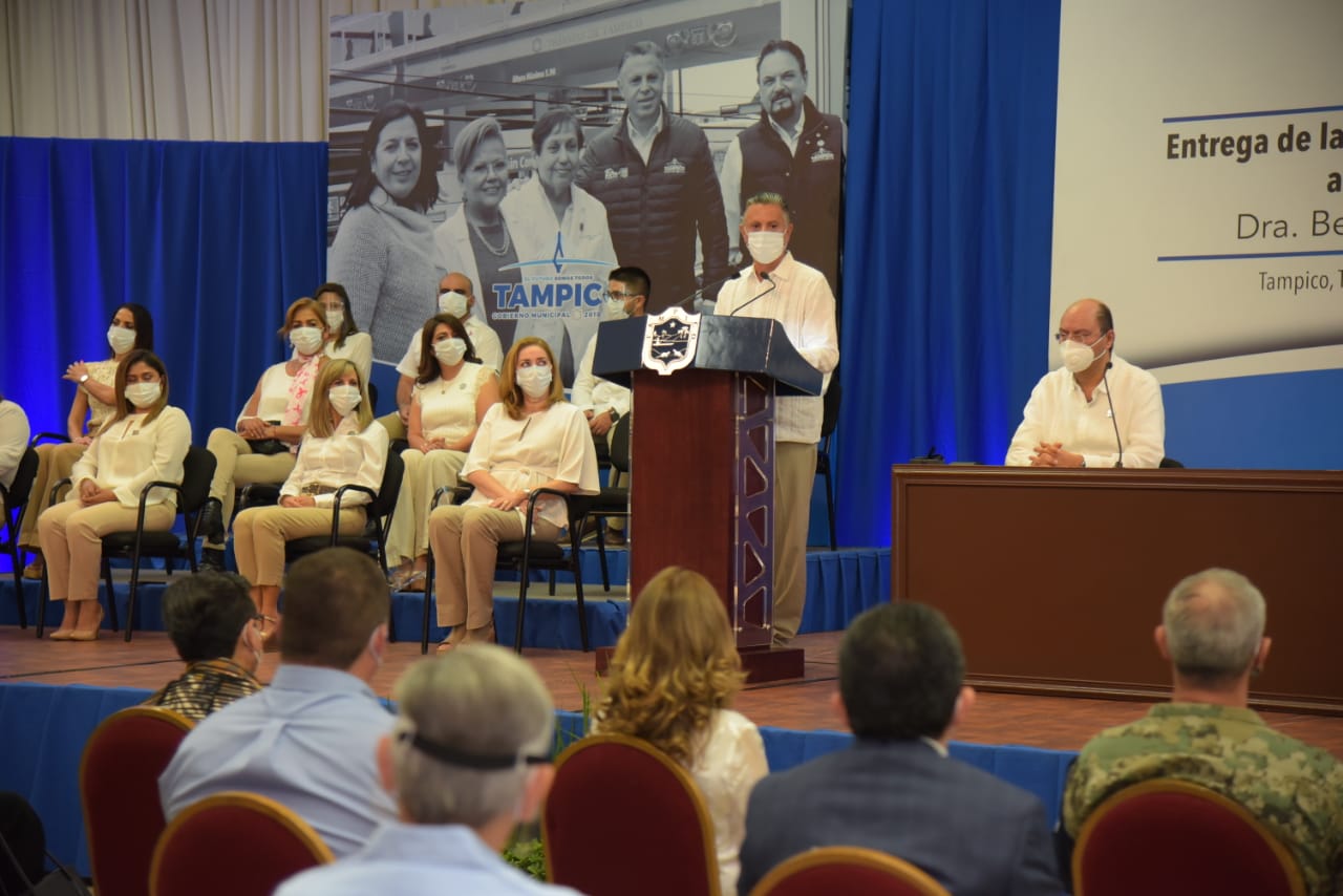 Durante la solemne ceremonia a la que asistieron también, la Presidenta del sistema DIF municipal, Aída Féres de Nader; el Comandante de la Primera Zona Naval, Vicealmirante DEM José Carlos Vera Vidal; los Diputados locales Mon Marón y Rosa González; y representantes de los sectores, empresarial, médico y de la mesa de seguridad y justicia, el Alcalde porteño destacó la trayectoria y contribución de la profesionista al bienestar de los tampiqueños durante los más de 38 años en que ha radicado en esta ciudad.