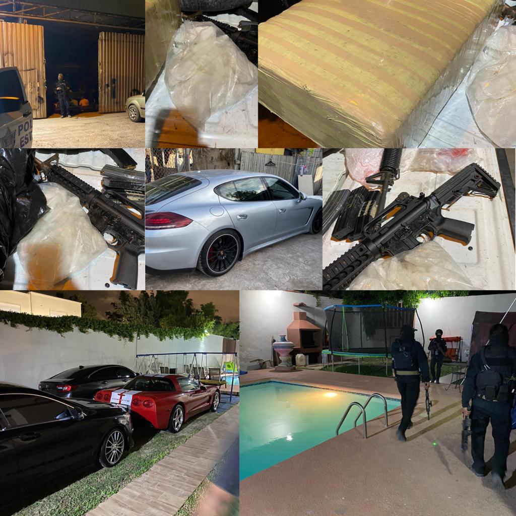 Al hacer una revisión se encontraron un paquete y bolsas transparentes con hierba seca y verde, así como 10 cargadores abastecidos de arma larga y una corta, además de diversos vehículos. No hubo detenidos y se investiga quién es el propietario, al parecer relacionado con un grupo delictivo.
