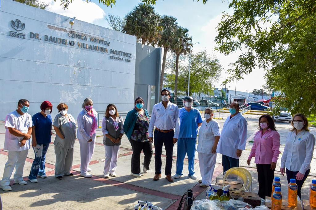 En representación del DIF Reynosa, el presidente del Patronato junto a su equipo de trabajo, visitó las instalaciones del ISSSTE Reynosa para entregarles artículos de la canasta básica, sueros, bebidas hidratantes, cubrebocas, caretas y desinfectantes.