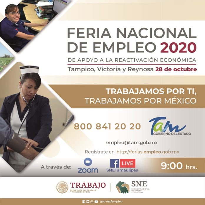 Ciudad Victoria Tamaulipas.- La Secretaría del Trabajo a través del Servicio Nacional de Empleo Tamaulipas, participará de la Feria Nacional de Empleo en Apoyo a la Reactivación Económica 2020, en beneficio de las personas que buscan trabajo.