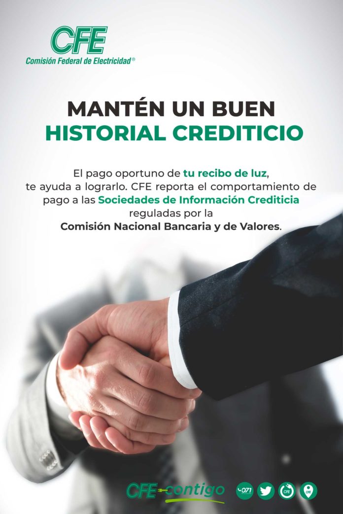 “Hacemos de tu conocimiento que la CFE, suministrados de servicios básicos tiene contrato con las sociedades de información crediticia autorizadas por la Secretaria de Hacienda y Crédito Público, como son el Buró de crédito y Circuito de Crédito, ambas reguladas por la Comisión Nacional Bancaria y de Valores.