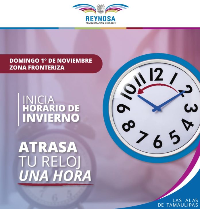 REYNOSA, TAM.- El Gobierno Municipal de Reynosa informa a la población que el próximo domingo 1 de noviembre el reloj deberá atrasarse una hora, de acuerdo a lo dispuesto por el Centro Nacional de Meteorología, CENAM, y que tendrá vigencia de cinco meses.