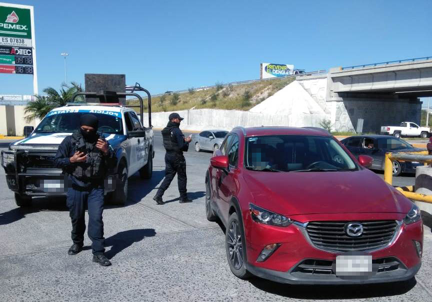 Tras abocarse a la búsqueda, los Policías Estatales le dieron alcance a la altura de la colonia López Portillo 3, a una camioneta Mazda CX3 color rojo con placas de circulación del estado de Nuevo León que coincidía con la descripción del reporte.