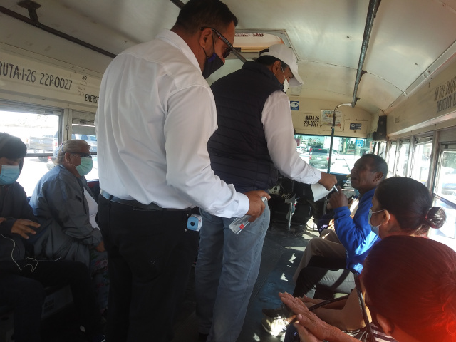Matamoros, Tamaulipas.- Con el objetivo de prevenir el aumento de casos de Covid-19 en esta frontera, personal de la Comisión Estatal para la Protección Contra los Riesgos Sanitarios (Coepris), mantiene los operativos en el transporte público para que los usuarios utilicen el cubrebocas y se apliquen el gel antibacterial.