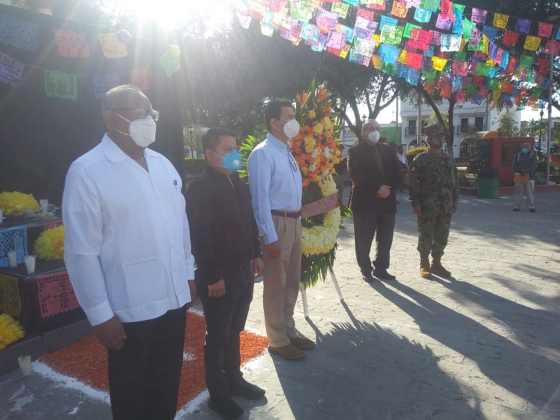 Se guardó un monto de silencio por los miles de muertos a causa del Covid-19, colocando la corona de flores en el altar instalado en la Plaza Principal, en donde también se hizo un monumental tapete de la flor de cempasúchil.