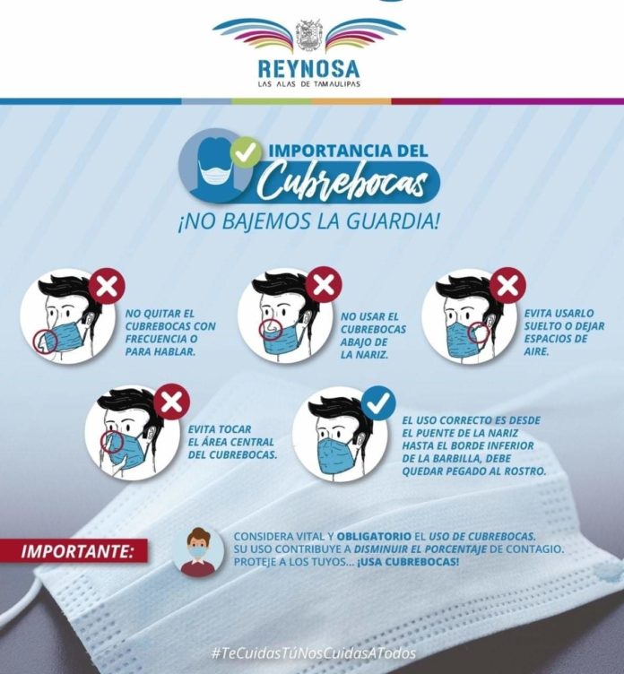 REYNOSA, TAM.- El R. Ayuntamiento de Reynosa exhorta a la comunidad a hacer uso correcto del cubrebocas al salir del hogar, para evitar propiciar el contagio de la enfermedad COVID-19, la cual ha tenido un incremento notable en el país, como también sucede en esta localidad.