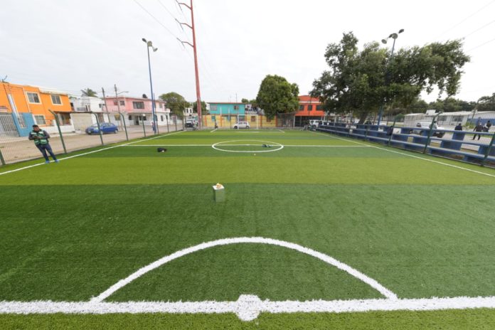 Lo anterior lo dio a conocer el Presidente municipal Chucho Nader tras efectuar la supervisión de los trabajos realizados en la cancha de pasto sintético de la colonia Solidaridad, Voluntad y Trabajo, donde personal de obras públicas lleva a cabo la restauración del material sintético, así como la reposición de la malla periférica y obras de mejoramiento integral en este sitio.