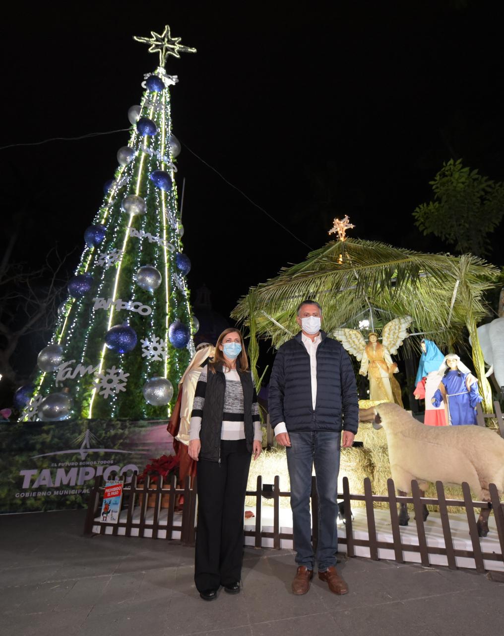 Tampico, Tamaulipas.-Con la finalidad de generar entornos que contribuyan a la convivencia familiar atendiendo las medidas de protección sanitaria, el Presidente municipal Chucho Nader inauguró la noche de este jueves, el encendido del Pino Navideño y el Nacimiento de la Plaza de Armas y posteriormente encendió el túnel luminoso de la calle peatonal Salvador Díaz Mirón en la zona centro de la ciudad.