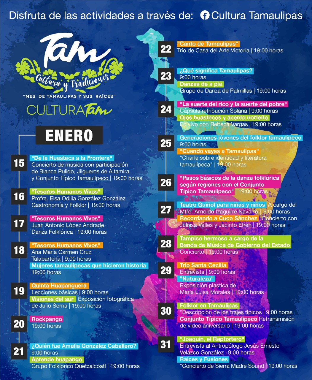 El programa dio inicio con el concierto “De la huasteca a la frontera” con la participación de Blanca Pulido, Los Jilgueros de Altamira, el Conjunto Típico Tamaulipeco y músicos invitados para disfrutar de los mejores exponentes del huapango. Tamaulipas y sus raíces continuará durante todo el mes de enero con capsulas de nuestros Tesoros Humanos Vivos, la exposición fotográfica “Visiones del sur”, una charla a cargo de la actriz y conductora tamaulipeca Rebeca Vargas, conciertos a cargo del Trio de Casa del Arte Victoria, Sierra Madre Sound, Julissa Valles, Jacinto Efrén y muchas actividades más totalmente virtuales a través del Fb oficial de Cultura Tamaulipas.
