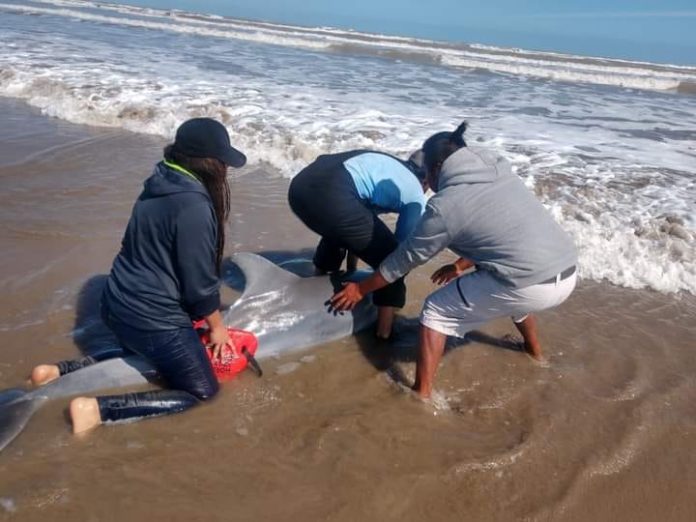 Cd. Victoria, Tamaulipas._ De nueva cuenta los Policías Estatales rescató a un delfín que se encontraba varado en la arena de la playa del poblado, El Mezquital en el municipio de Matamoros.