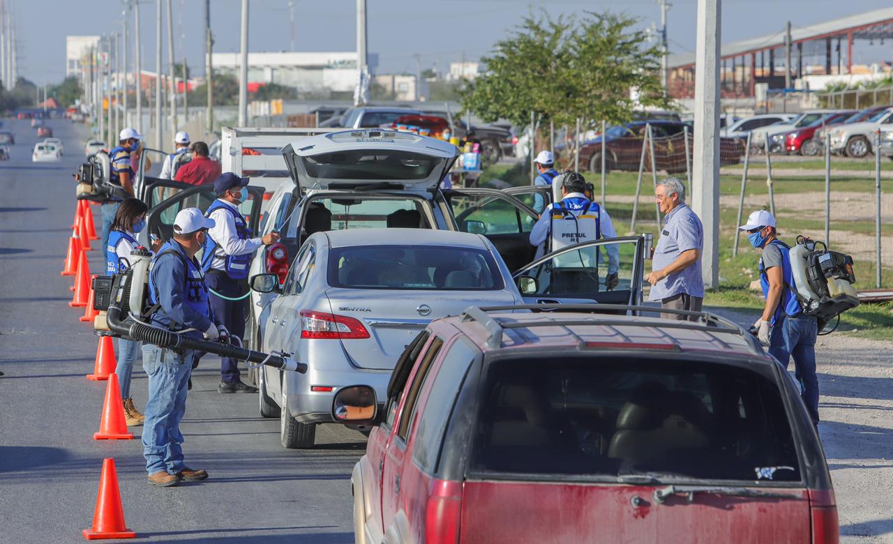 Reynosa, Tamaulipas.- Cerca de 300 conductores de unidades de transporte público y particulares de Reynosa participaron en una nueva jornada de desinfección contra el COVID-19 en Reynosa, a fin de prevenir contagios contra la enfermedad.