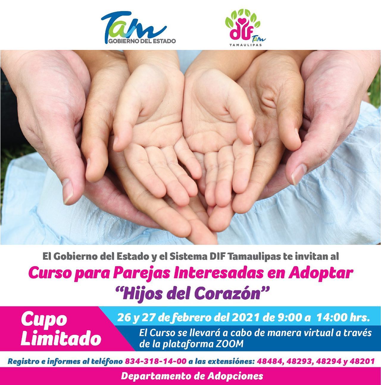 Ciudad Victoria, Tamaulipas.-El Gobierno del Estado y el Sistema Para el Desarrollo Integral de la Familia de Tamaulipas, que preside Mariana Gómez de García Cabeza de Vaca, invitan a parejas interesada en adoptar, al curso virtual “Hijos del Corazón” que se llevará a cabo el 26 y 27 de febrero del 2021 a partir de las 9 de la mañana.