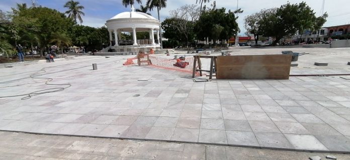 Altamira, Tamaulipas. Con una inversión superior a los 6 millones de pesos, gobierno del estado en coordinación con la autoridad municipal avanza en las labores de modernización de la plaza Constitución de Altamira.