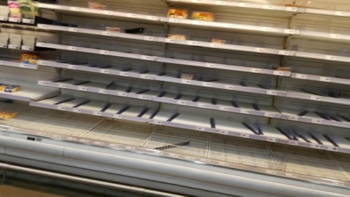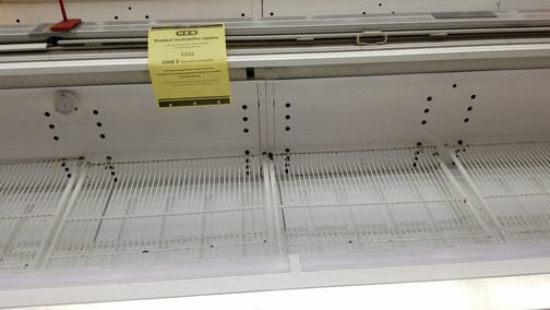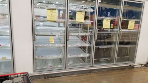 Valle de Texas.-Usuarios de las redes sociales del Valle del Sur de Texas, han difundido fotografías de los anaqueles y refrigeradores de los supermercados vacíos, esto generado por las compras de pánico que se registran a causa de las heladas y falta de energía eléctrica.