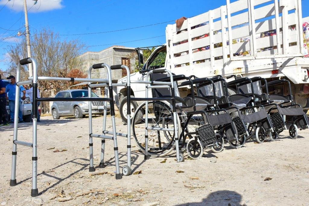 A las familias se les entregaron artículos de la canasta básica, fruta, verdura y cubrebocas, así como sillas de ruedas, bastón, muletas o andador a quienes presentan alguna discapacidad.