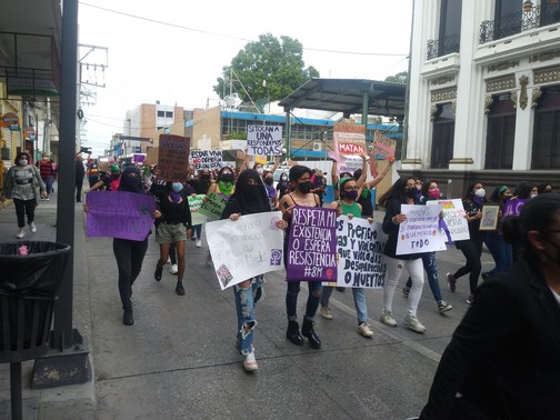 Caminaron por toda la avenida Hidalgo gritando “Justicia”, “Señor, señora no sea indiferente se mata a las mujeres en la cara de la gente”, “Queremos justicia, no más violencia contra las mujeres”, “Ni una más, ni una más, ni una más, ni una asesinada más”, para luego seguir por la calle Altamira y después tomar la calle Colón hasta llegar a la Plaza de Armas, frente a Palacio Municipal, que estuvo resguardado por policías estatales, así como también la iglesia Catedral.