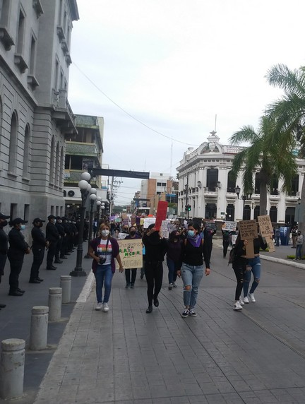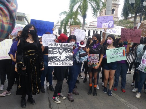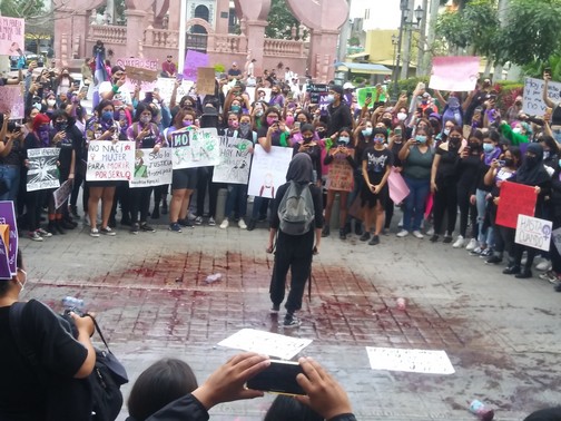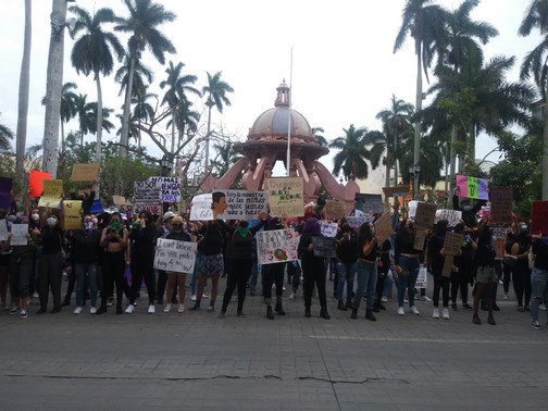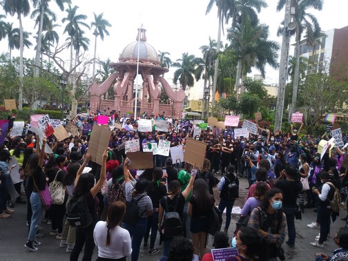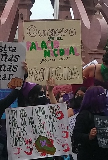 A las 16:00 horas 250 féminas iniciaron su recorrido desde la Avenida Hidalgo esquina con calle Moctezuma, unas vestidas, con playeras de color moradas y otras negras, un paliacate color verde y con el rostro cubierto, portando pancartas que decían “Si tocan a una responderemos todas”, “Ni una más”, “Si mañana soy yo quemalo todo”, “Las mujeres Trans son parte de mi lucha”.