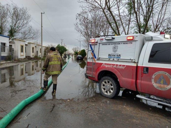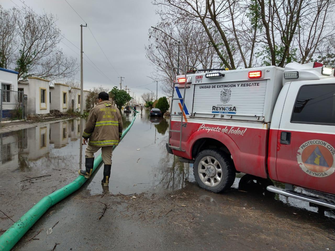 REYNOSA, TAM.- La Coordinación de Protección Civil y Bomberos del Gobierno Municipal de Reynosa atendió el llamado de habitantes del fraccionamiento Pirámides, que resultaron afectados por encharcamientos tras la lluvia que trajo el frente frío número 47.