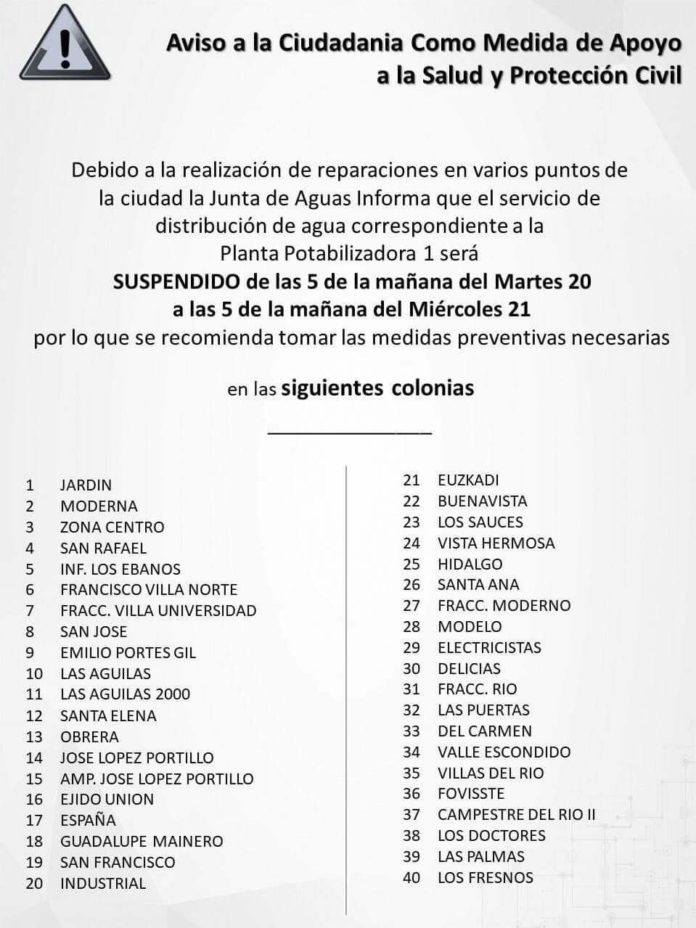 Matamoros, Tamaulipas.- En un total de 176 colonias y la zona Centro se suspenderá el servicio de agua potable desde las 5 de la mañana de este martes y se reanudarán el servicio hasta el miércoles.