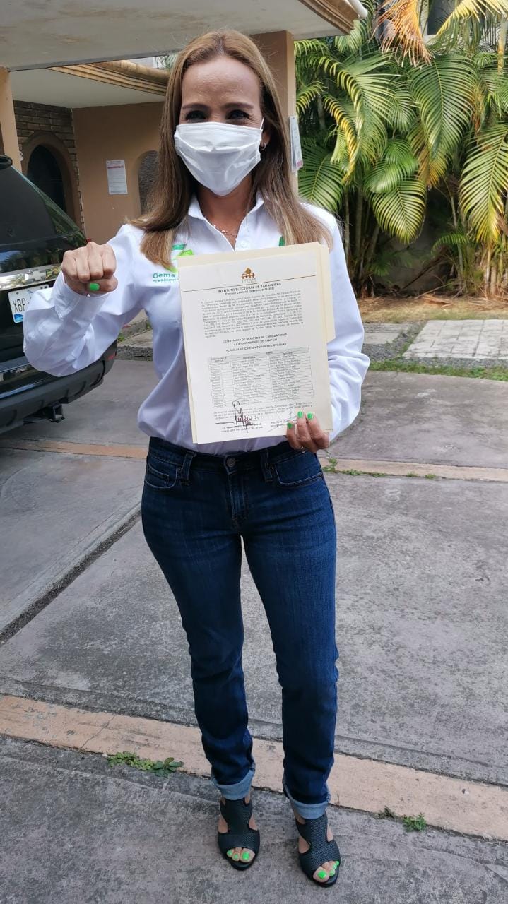 Tampico, Tamaulipas.-Al recibir la constancia del IETAM que acredita su candidatura, así como la planilla de sindicos y regidores, la abanderada del Partido Verde a la alcaldía de Tampico, Gema Acosta, manifestó que son perfiles nuevos con las ganas de trabajar y hacer el bien por las familias.