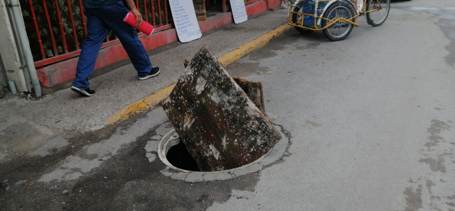 Encargados de los negocios explican que hace 20 días una persona unidad fracturé la tapadera fabricada a base de polímeros Y desde ese Entonces los empleados han colocado cubetas para advertir por el riesgo