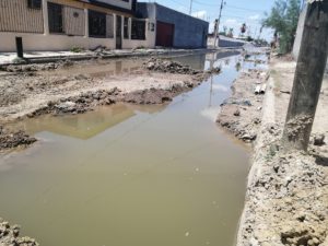Es una obra de pavimentación que como decenas que hay en la ciudad se encuentra inconclusa sobre la avenida La Paz, entre Héroe de Nacatáz y Santiago Sánchez, obra que desde noviembre del año pasado presenta severos brotes y escurrimientos de aguas residuales que mantienen de manera permanente inundada dicha avenida.