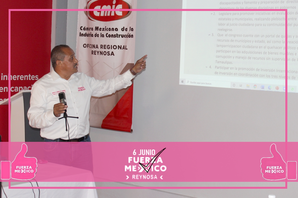 Reynosa, Tamaulipas.-El candidato a diputado local del distrito V por el partido Fuerza por México, Renato Zamudio, se reunió este jueves con integrantes de la Cámara de la Industria de la Construcción (CMIC) para dialogar a cerca de sus propuestas en materia de infraestructura para mejorar la ciudad de Reynosa.