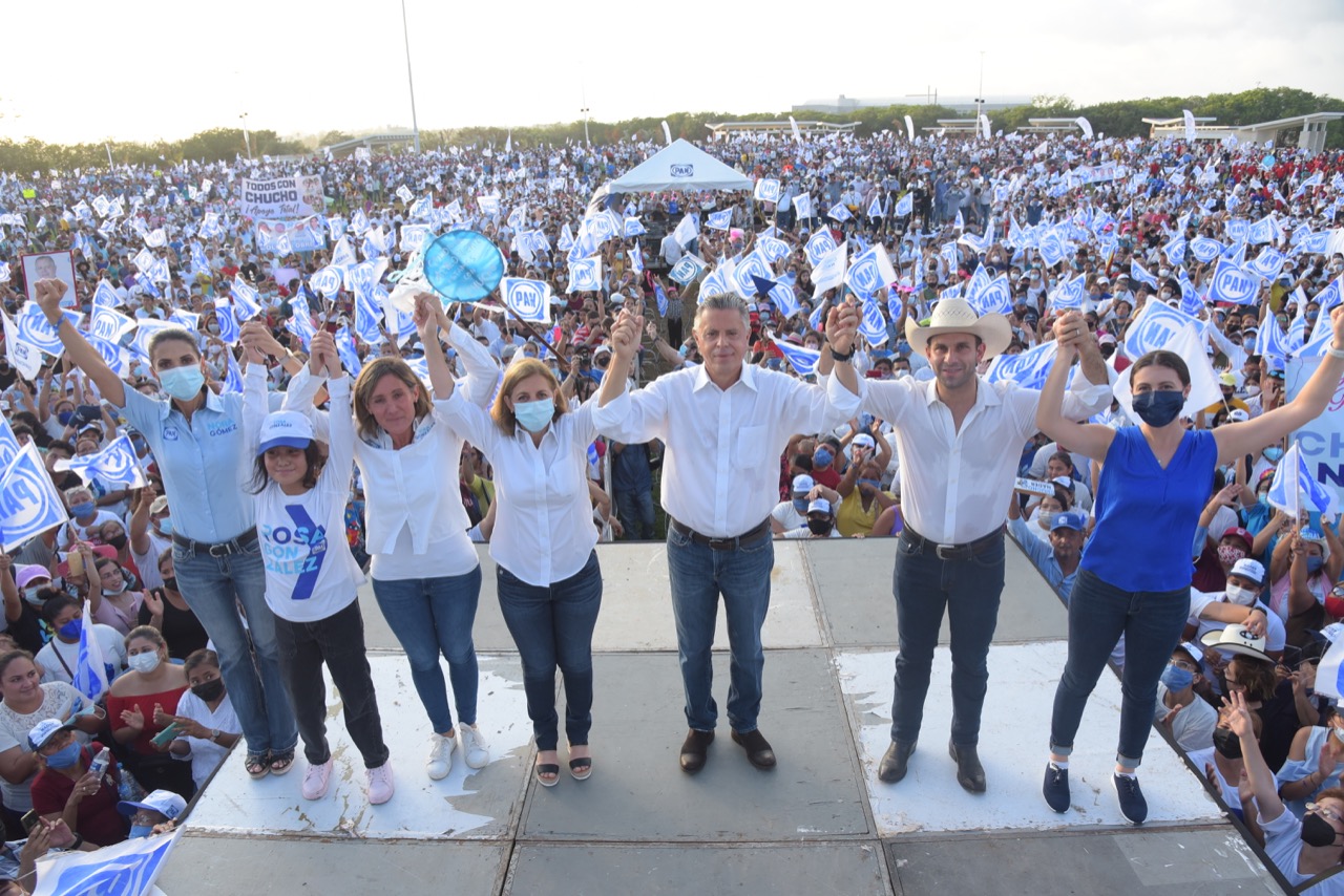 Tampico, Tamaulipas.-Espectacular fue el cierre de campaña de Chucho Nader y los candidatos del PAN a las Diputaciones Federal y estatal, Rosa González Azcárraga, Mon Marón y Nora Gómez González, efectuado este domingo en el nuevo recinto ferial de Tampico.