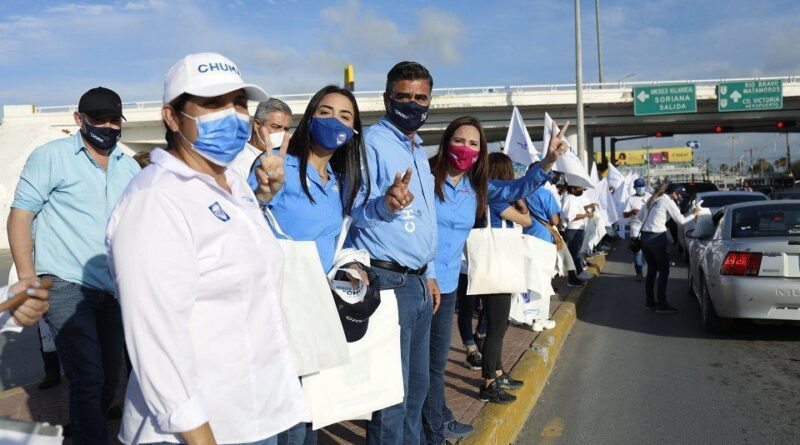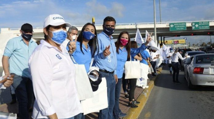 Reynosa, Tamaulipas.-En su última tarde de campaña antes de las elecciones de este domingo, Jesús Ma. Moreno, Chuma, acompañado de su esposa Maribel Villarreal de Moreno y su hija Isabella, participaron en un pegoteo realizado en el Puente de la Muerte y en los cierres distritales de campaña de los candidatos Claudia Pacheco y Javier Garza de Coss.