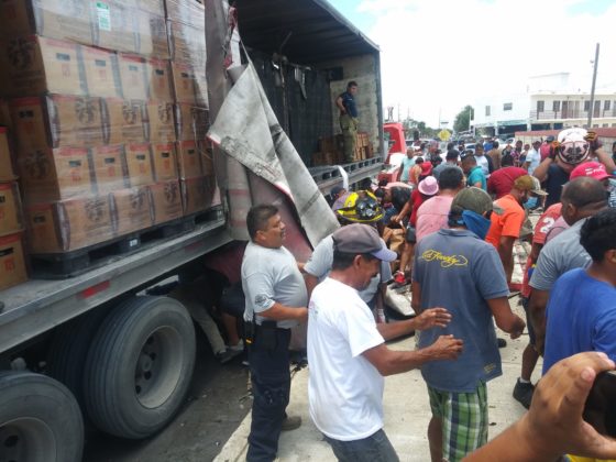 Fue alrededor de las 11 horas de este jueves cuando se notificó que una caja de trailer se había semivolteado, derrumbandose el producto que contenía, a lo que de inmediato llegaron vecinos de las colonias Popular y Treviño Zapata, así como más curiosos que pasaban por el sitio.