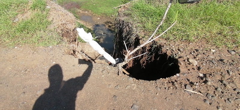 Señala que las excavaciones para reunir material de revestimiento conocido como champayán, en ambos lados del camino, en combinación con las lluvias han provocado el arrastre de una enorme cantidad de arena y por consiguiente los delavez que ponen en riesgo a los pobladores